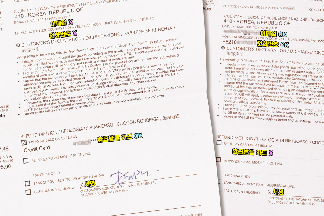 같은 택스리펀 대행사(글로벌블루)여도 매장에 따라 형식이 다르기도 합니다.